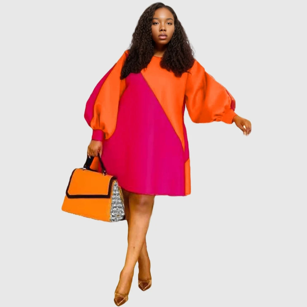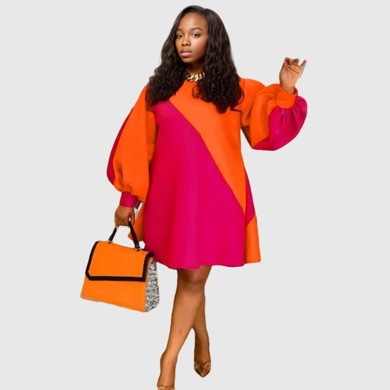 C0306TA1 New Design Casual Color Block Puff Sleeve Loose Dress Women Sehe Fashion